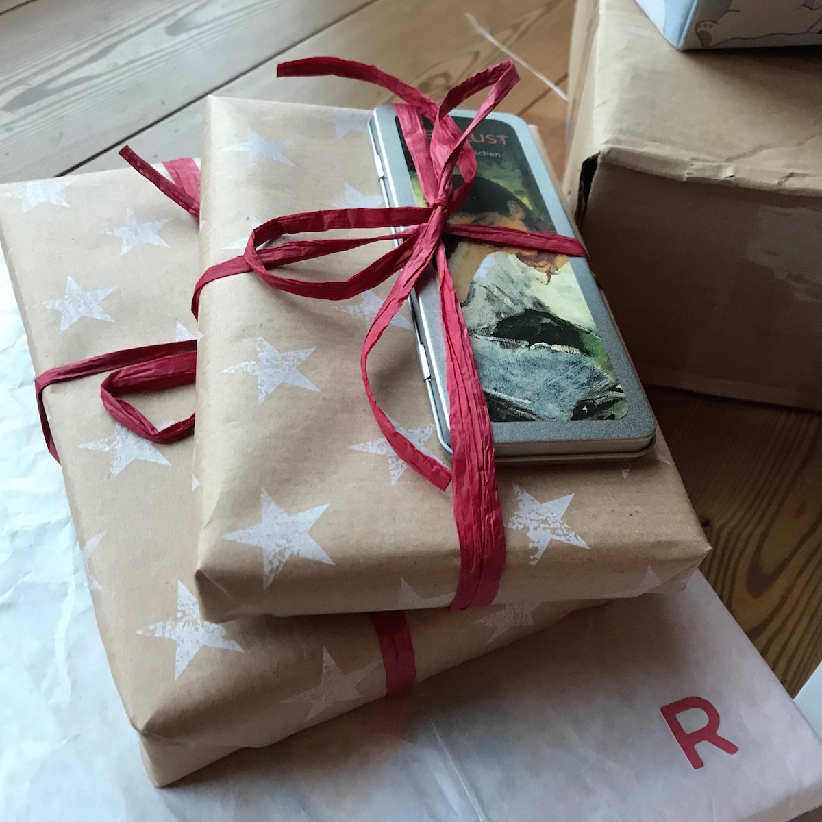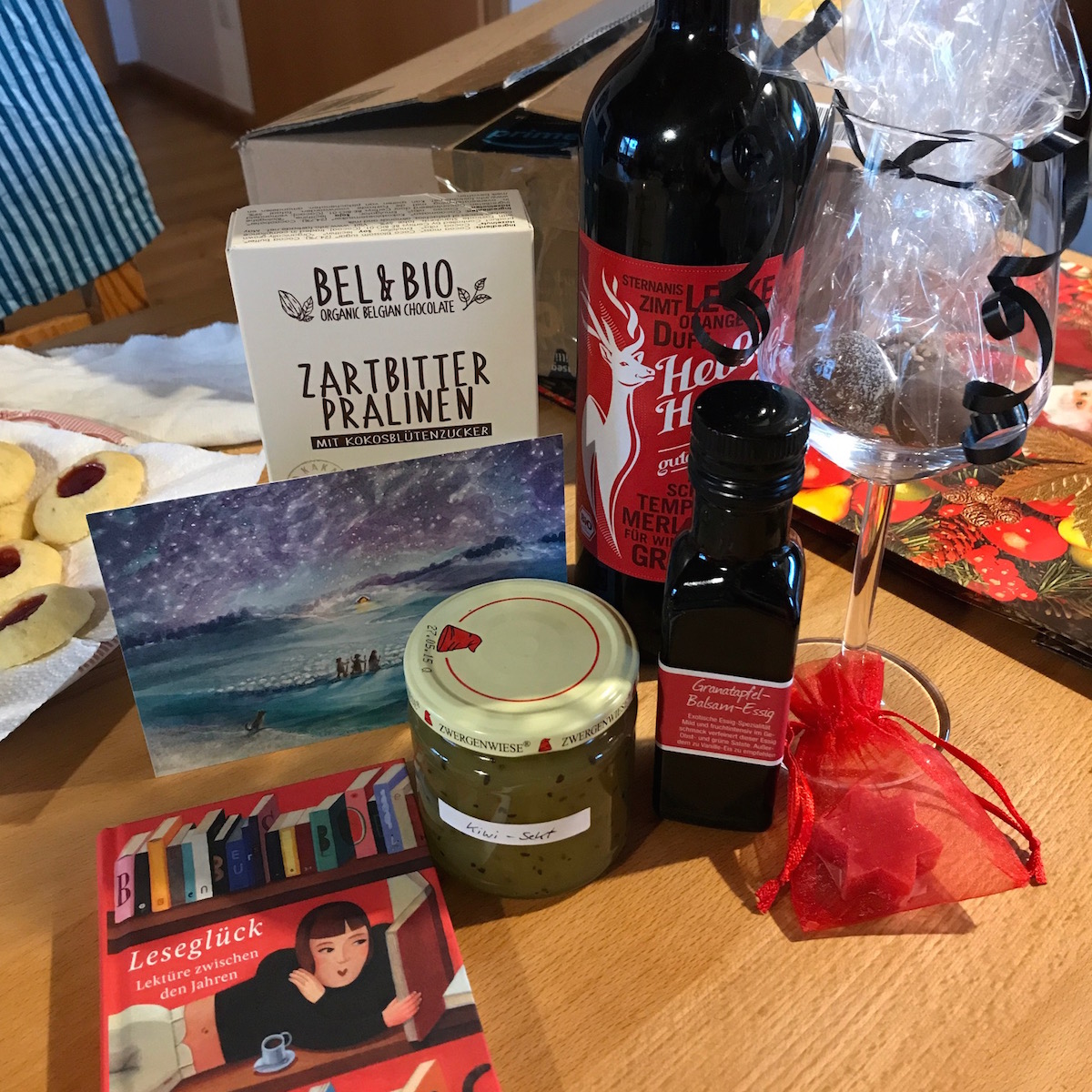 Danach haben wir unsere Familien-Wichtelgeschenke ausgetauscht. Das war so schön zu sehen, wie sich jedeR Mühe gegeben hat, für die/den zu BeschenkendEn etwas zu basteln oder zu besorgen. Manche erst in letzter Minute, aber alle von Herzen. Der Wolf hat für die Tochter gestrickt, die Tochter hat dem Sterngucker einen Motorrad- oder Longboardmitfahrgutschein gebastelt mit einem schönen Bild, der Sterngucker hat für den Mann ein Bild gemalt, der Mann hat mir ein kleines Lieblingskörperöl geschenkt und ich dem Wolf zwei Kopfhörerkabelsalataufräumer. Nach dem Wichteln haben wir Kartoffelsalat und (Tofu)würstchen gegessen und danach einen Film (“Als der Weihnachtsmann vom Himmel fiel”) geschaut.