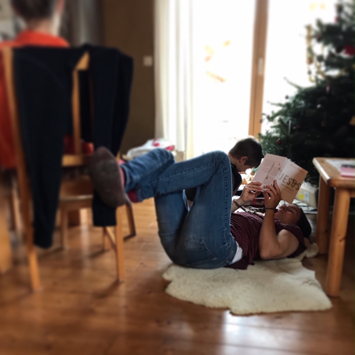 Am Morgen des 25. starteten wir den Tag mit einem gemeinsamen Frühstück und der Bescherung. Das ist ein schöner Anblick, noch im halbdunkel die Geschenke unter dem beleuchteten Baum stehen zu haben und dann genüsslich eins nach dem anderen auszupacken. Der Tag ging dann fliessend ins weihnachtliche Rumgelungere über. Da wurden die neuen Spielsachen bespielt, in Bücher reingelesen, die unterm Baum lagen und nichts getan, was nicht unbedingt sein muss. Weil der Mann am 25.Dezember Geburtstag hat, bekam er natürlich noch sein Geburtstagsständchen von uns gesungen und gespielt.
