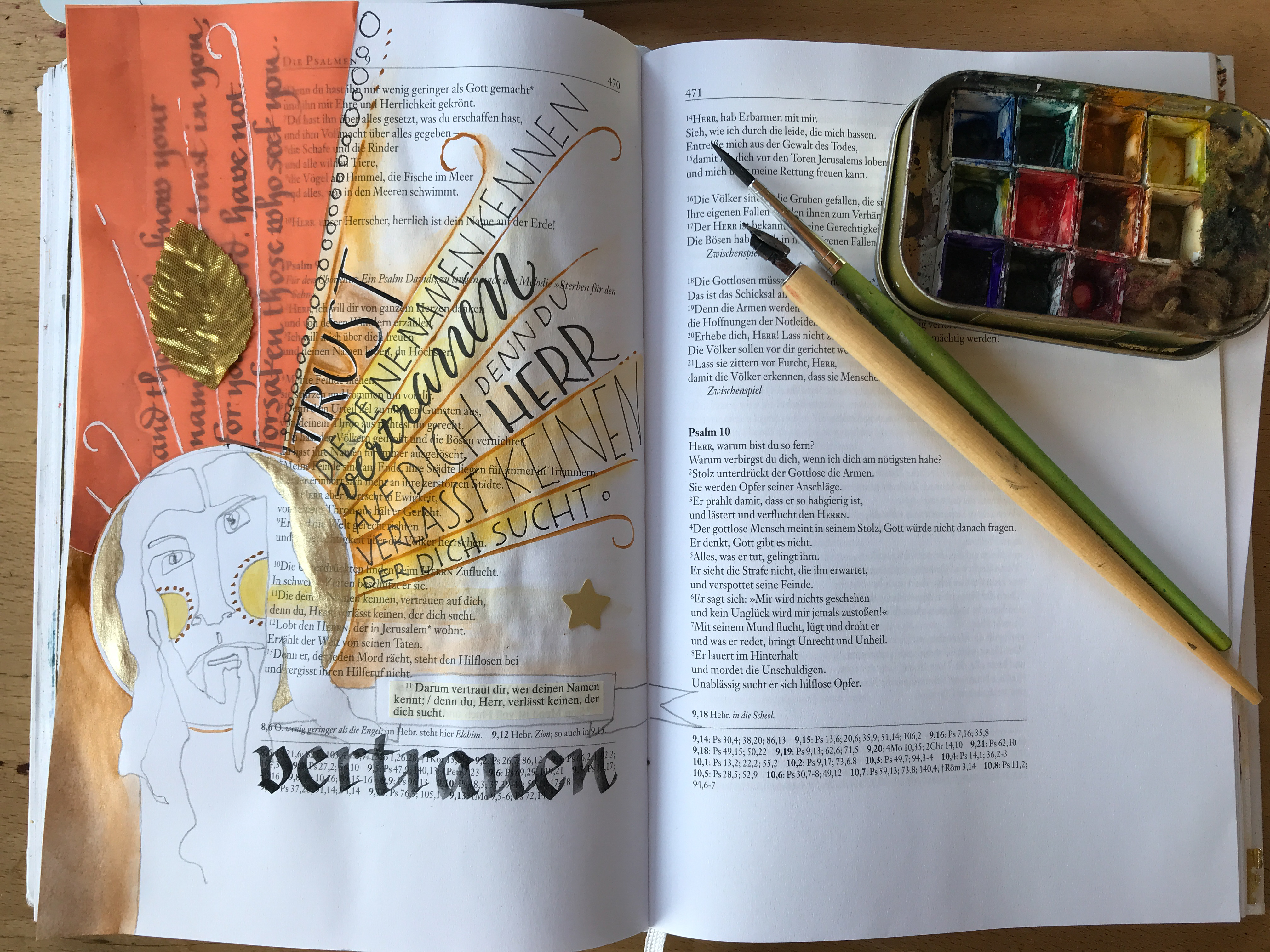 Das Wochenende war herrlich sonnig. Ich habe es mit einem Online-Bibleart-Journaling-Treffen begonnen, was die Administratorin der deutschen Bibleartoujournaling-Facebookgruppe organisiert hatte. Gemeinsam haben wir Psalm 9,11 gestaltet. Das war ein sehr schöner Vormittag. Währenddessen hatte der Mann einen Online-Workhop mit seiner Gongausbildungsgruppe, die sich normalerweise an diesem Wochenende zu einem Ausbildungsmodul getroffen hätten. Die Kinder haben sich selbst beschäftigt. Sie können hier nach wie vor rein und raus. Ein großes Privileg.