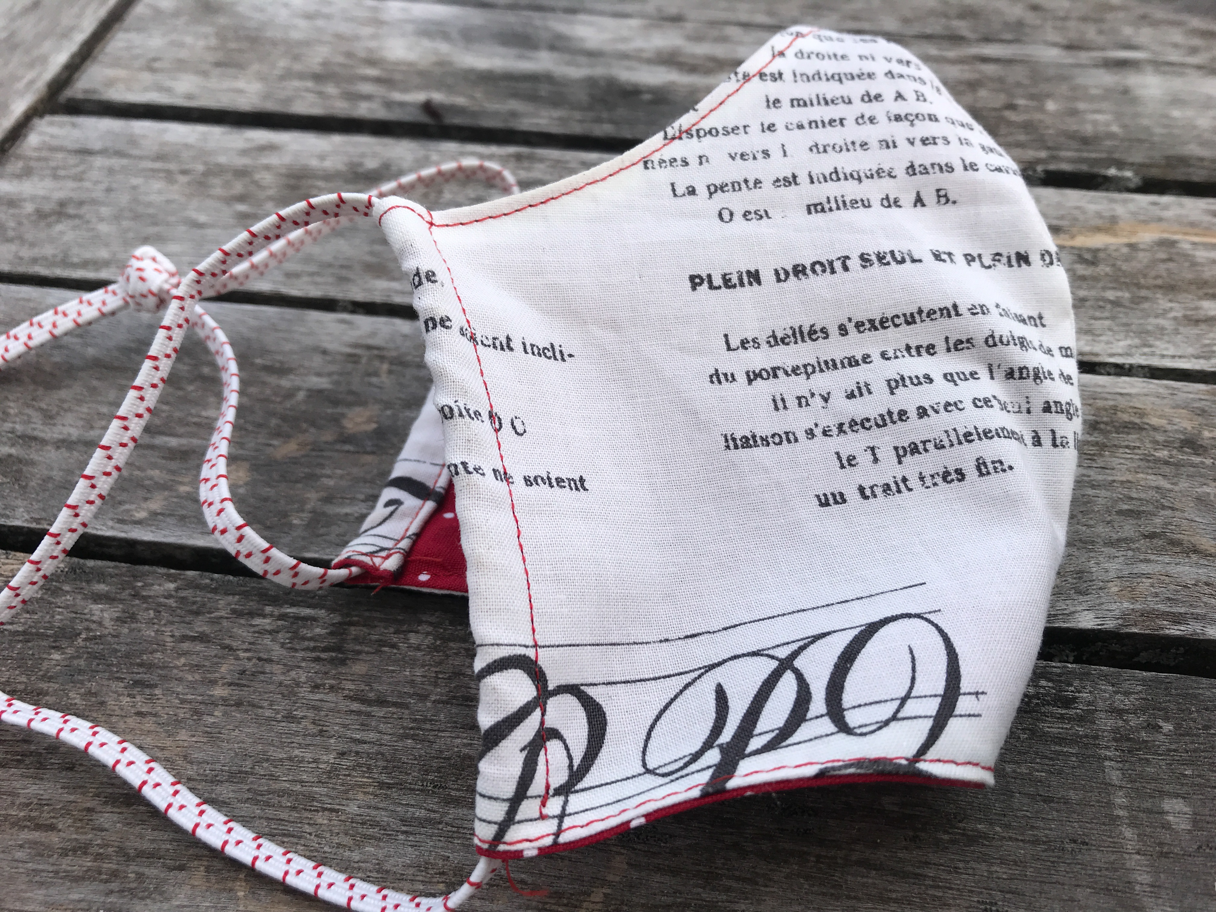 Den Nachmittag habe ich genutzt und mich mal dem Thema Masken genähert. In den vergangenen Tagen habe ich mir schon einige Modelle ausgeguckt, die ich probieren möchte. Hier findest du eine Übersichtsseite mit einer ganzen Sammlung an Modellen. Bei Alexandra Renke gibt es eine Anleitung zum kostenlosen Download und auch Rebecca von Elfenkind Berlin hat sich Gedanken gemacht. Ich habe ein erstes Modell genäht, was direkt ganz gut gelungen ist. Der Stoff hat natürlich ein Kalligrafie-Thema (sieht man vernäht nicht so gut).