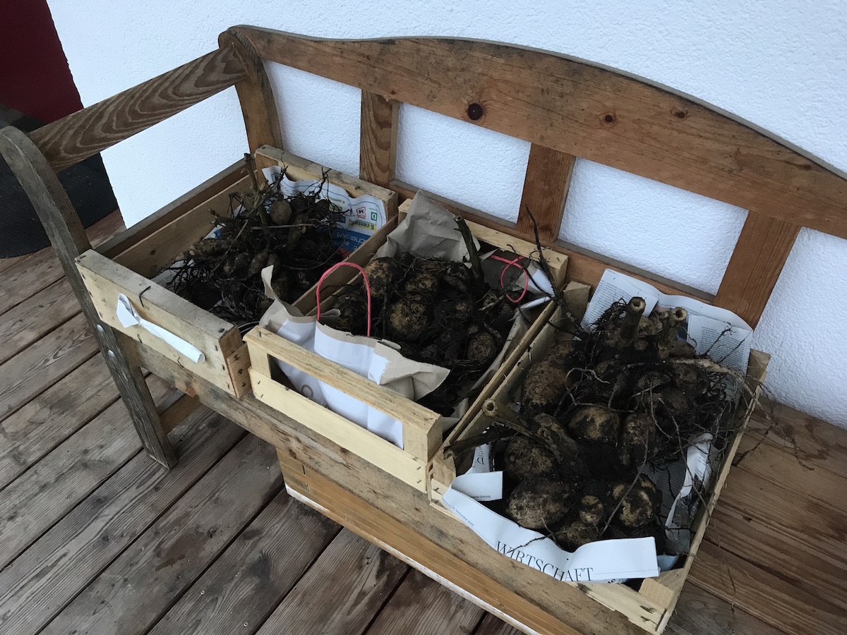 Nach dem Tag der offenen Tür war ich noch ein bisschen draussen im Garten. Die Temperaturen sind gerade mild, es regnet. Ich wollte unbedingt ein paar Pflanzen noch in die Erde bringen, die ich von einer Bekannten bekommen habe. Und die Dahlienknollen mussten aus der Erde, bevor es richtig friert.