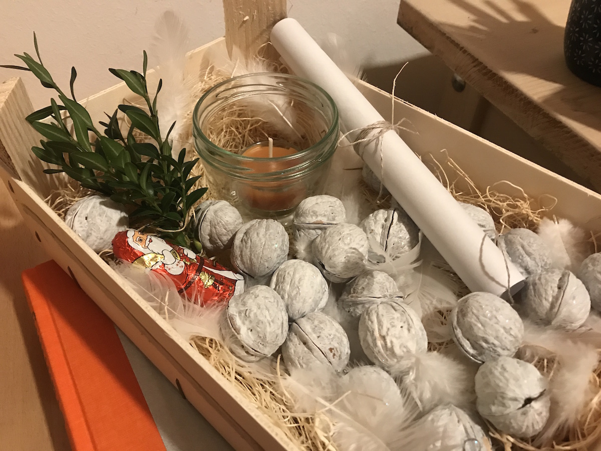 Das sind angemalte Walnuss-Häften, die ich mit kleinen Zettelchen oder Schokokugeln gefüllt und wieder zugeklebt habe.