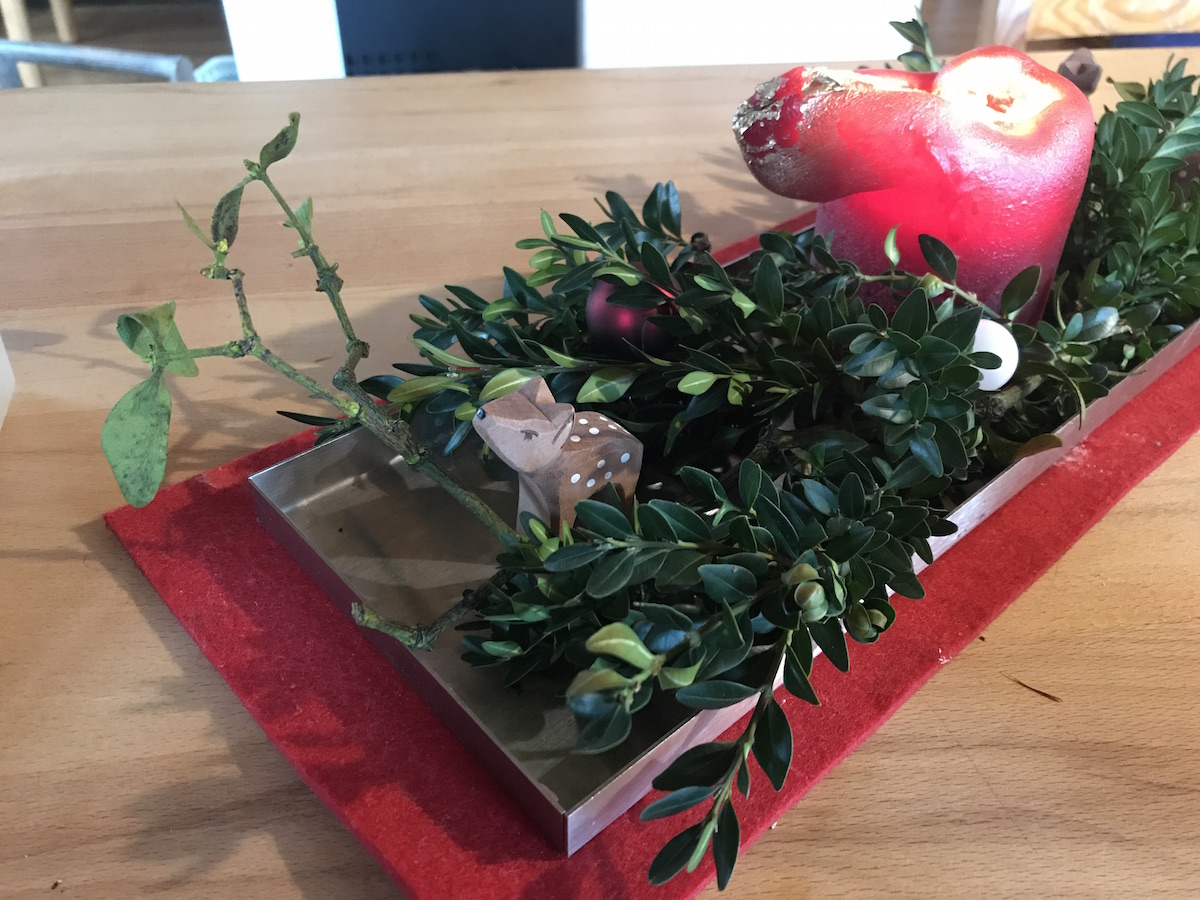 Am Abend habe ich unseren Tisch aufgehübscht. Wir haben dieses Jahr keinen Adventskranz, stattdessen eine Kerze und etwas Grün aus dem Garten.