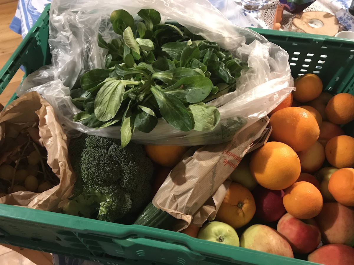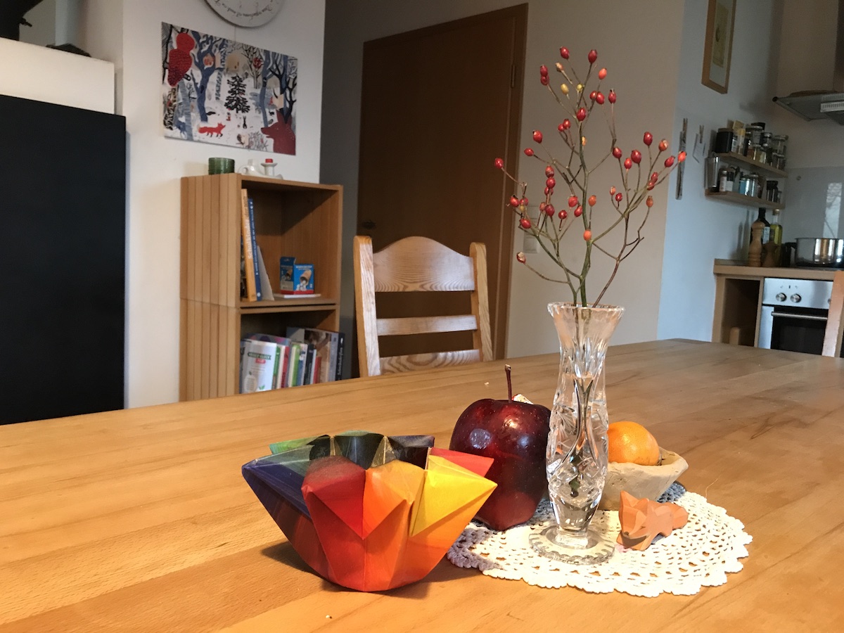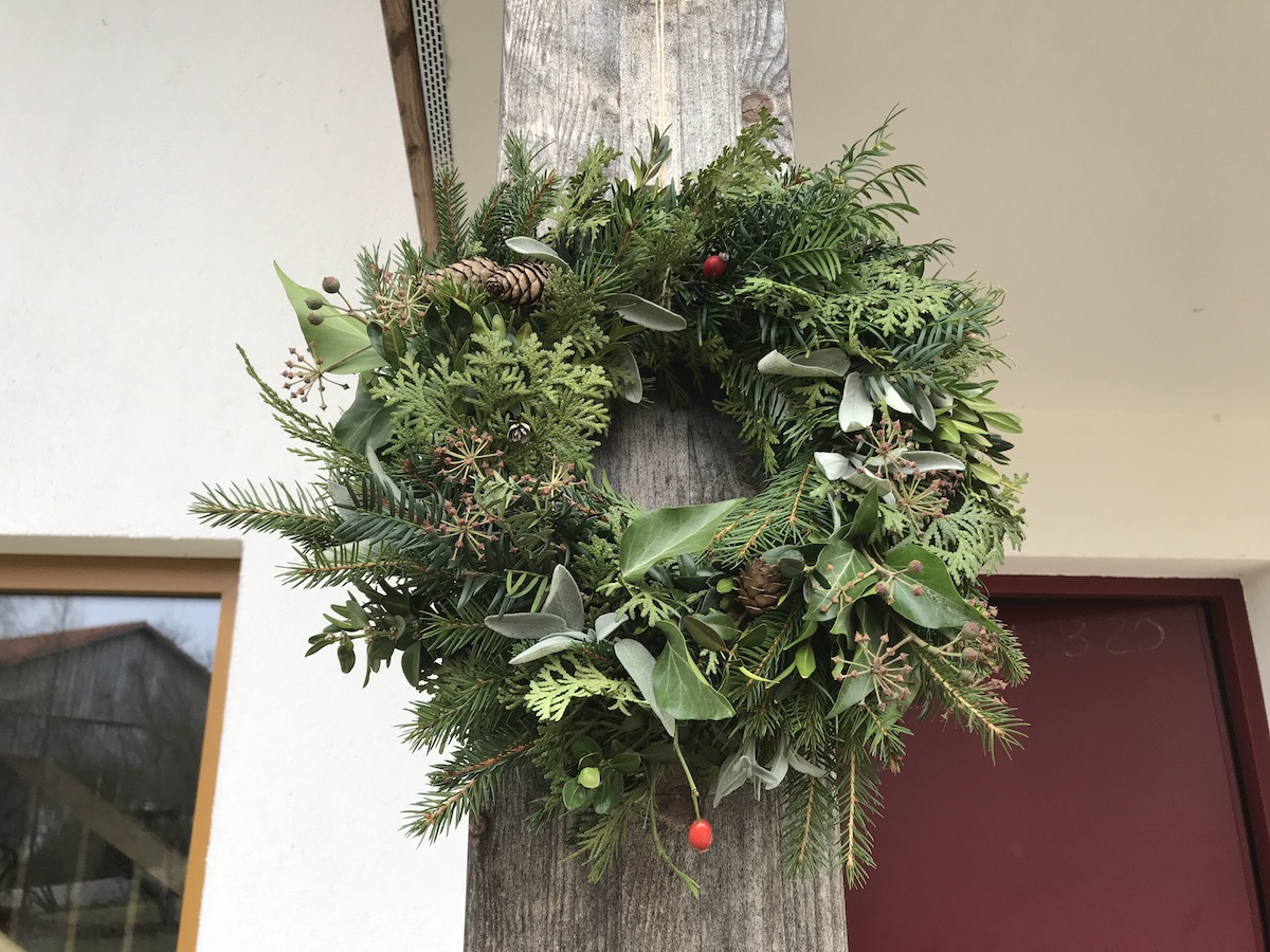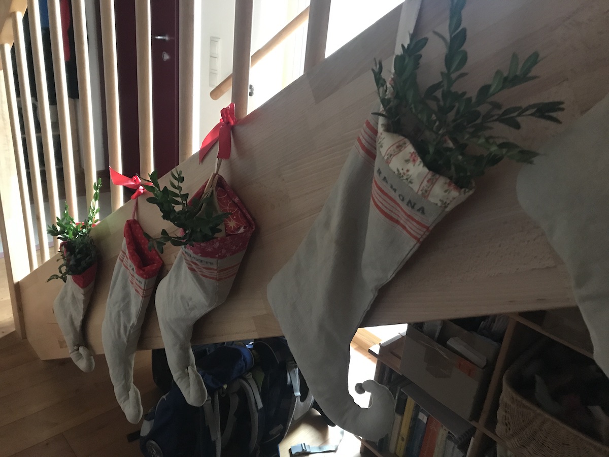 Den Winterkranz der Tochter vorm Haus aufhängen, mich über die Gemüsekiste freuen (riesiger Feldsalat!), mit dem Mann ein Hochzeitstagfrühstück nachholen am heimischen Küchentisch, lange Gespräche führen, Ingwershots gegen eine nahende Erkältung trinken, Suppe kochen mit frischem Lauch aus dem Garten, Nikolauskleinigkeiten verpacken. Nicht hingucken dürfen, wenn ein aufgeregter Sterngucker Nikolausgeheimnisvolle Bastelein am Küchentisch startet. Schuhe putzen, Wichtelsocken aufhängen und befüllen. Zimmertauschideen mit dem Mann erdenken und das große Doppelbett abbauen (braucht jemand im Umkreis ein 2 x 2m Buche Doppelbett von Allnatura, 8 Jahre alt?)