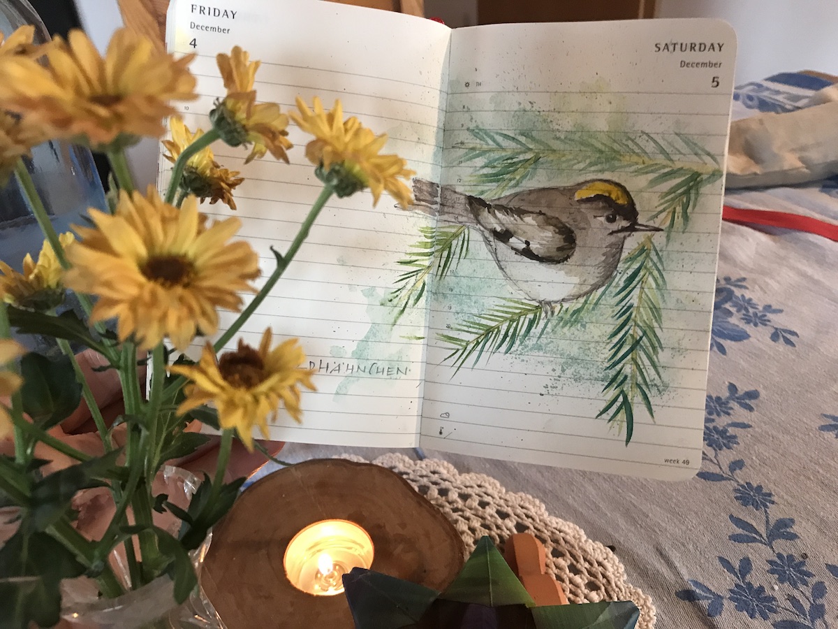 Eine schlechte Nacht wegen Sturmgeräuschen haben, gemütlich frühstücken und dem Adventsgottesdienst auf erf.de zuschauen. Dabei das Goldhähnchen von Samstag in mein kleines Moleskine zeichnen. Ein wenig nachdenklich über eine Frage aus dem Gottesdienst sinnieren: