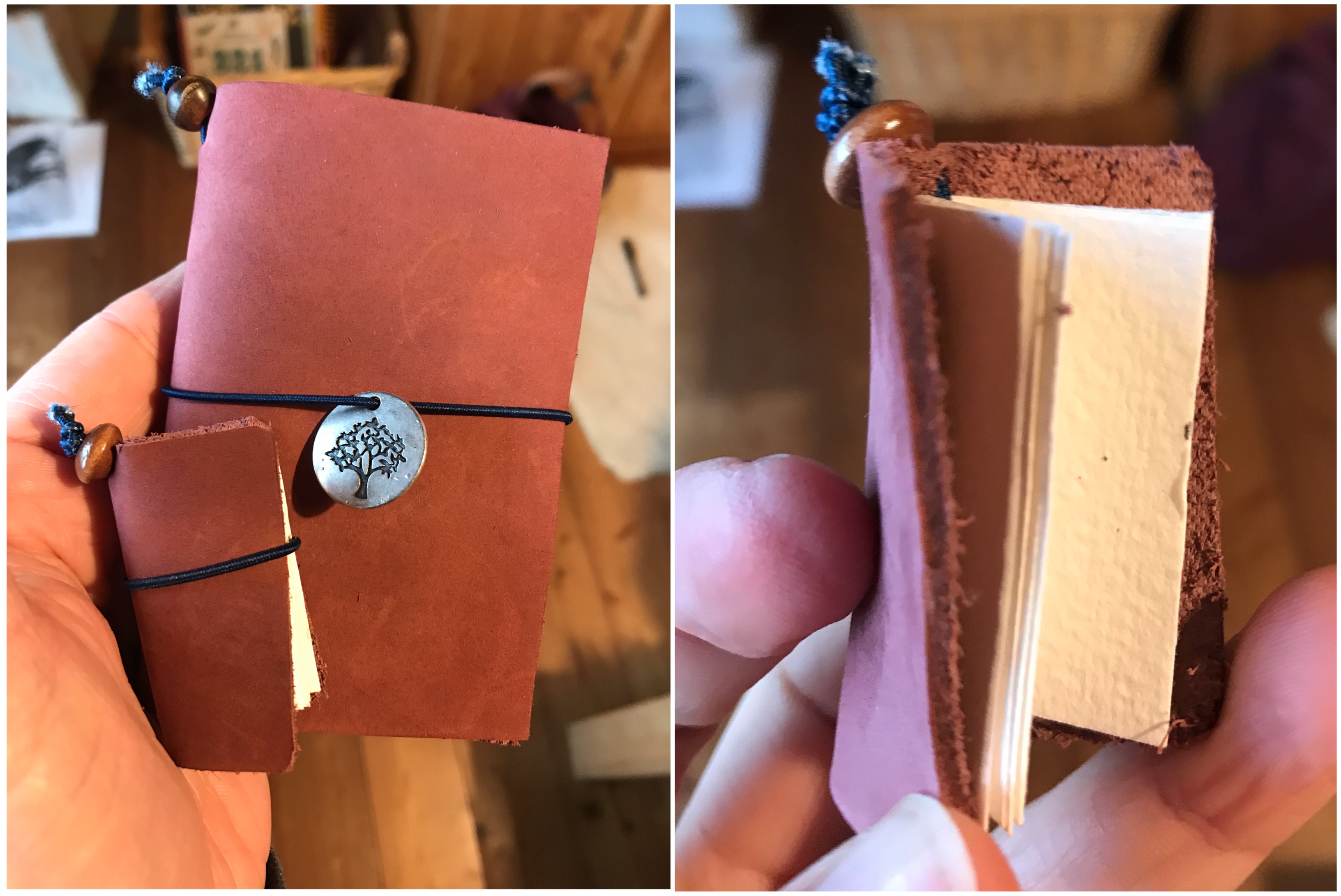 Aus einem Stück Leder schneide ich zwei kleine Traveler’s Journals aus. Das wollte ich schon immer mal machen. Zwar nutze ich mein Original gerade nicht, hatte aber Lust diese beiden Nachahmungen zu basteln. Nun brauchen sie noch ein Innenleben.