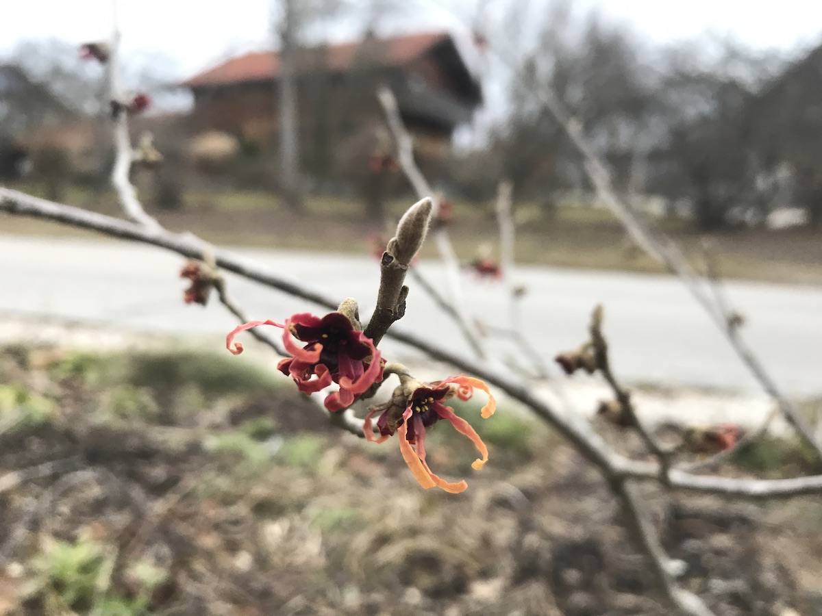 Draussen braut sich ein Wetter zusammen. Ich merke deutlich, wie es irgendeine Luftdruckveränderung gibt. Ich bin etwas schlapp und laufe untertourig. Die Jungs verbringen viel Zeit auf dem Spielplatz. Es ist ja auch so warm, dass man sogar ohne Jacke draussen sein könnte. Ich beschliesse einen kleinen Spaziergang und besuche die Fussballspieler, die gerade mit einer Katze am Spielplatz schmusen. Dann treffe ich eine Freundin aus unserem Mütterkreis, die auf ihrer Hunderunde ist. Wir unterhalten uns eine Weile. Dann kommt immer mehr Wind auf und ich schlendere zurück nach Hause. Immerhin hatte ich Frischluft, wenn auch nicht sonderlich viel Bewegung. Meine Hamamelis blüht. Darüber freue ich mich jedes Jahr wieder. Die hat mir meine Schwester zum 40. Geburtstag geschenkt.