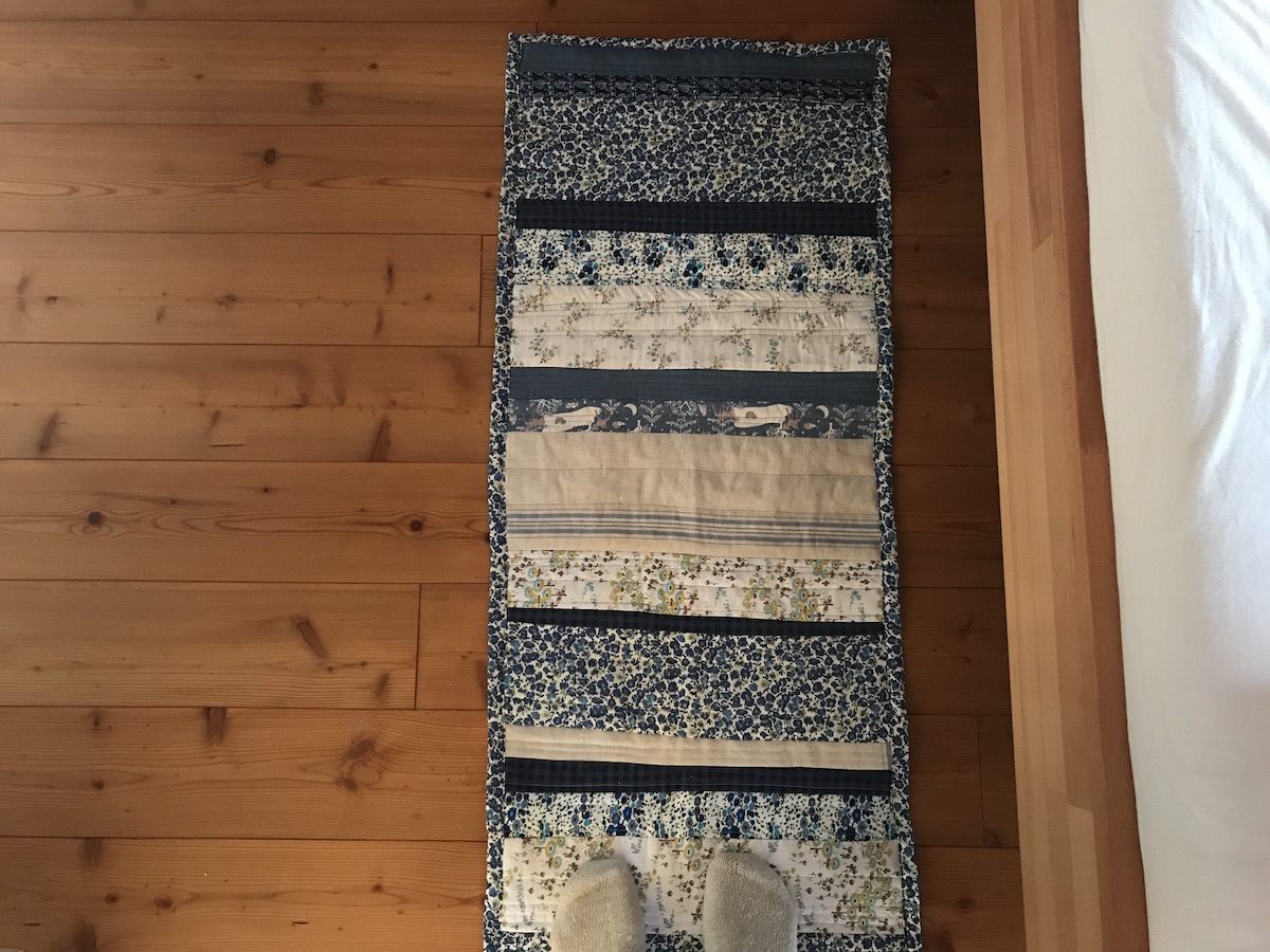 Ich kümmere mich um die Wäsche und vertrödele ein bisschen Zeit an der Nähmaschine. Eigentlich wollte ich einen Wimpel für Amberlight nähen, finde dann aber beim Stoffsichten in meiner Kiste noch ein vor vielen Jahren begonnenes Projekt: einen Bettvorleger. Den nähe ich erstmal fertig. Das war so eine Quilttechnik, wo man direkt alle drei Lagen vernäht. Hatte ich mal irgendwo im Internet entdeckt, als ich noch genäht habe.
