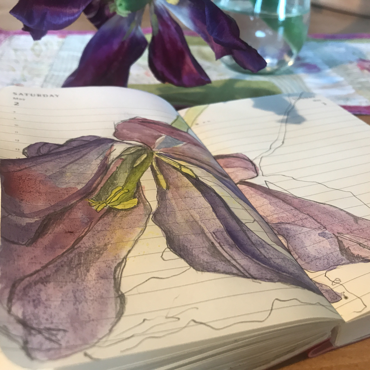 Gestaltet: Schriftenteppiche für den Kurs geschrieben, eine Tulpe ins Moleskine gezeichnet