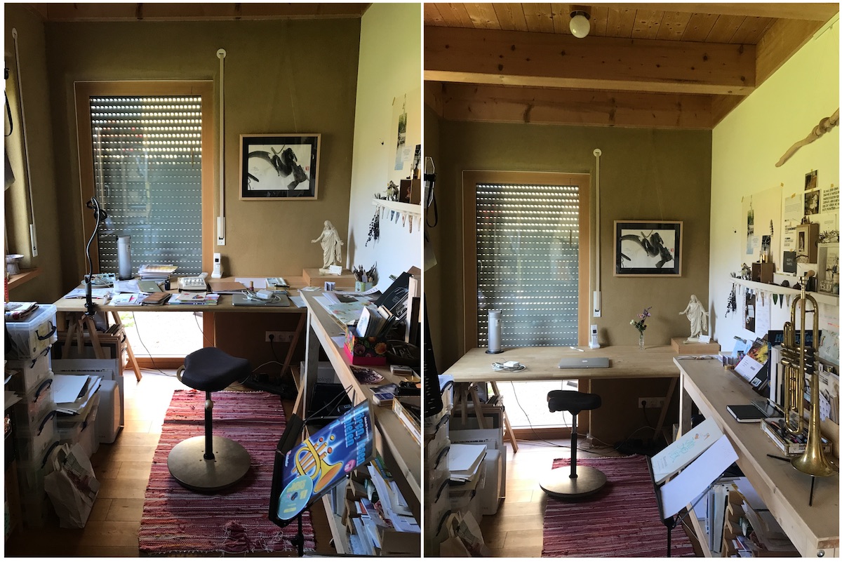 Wieder zu Hause geniessen wir die letzten Ferientage, bevor die Schule am Dienstag startet. Wir sind am Freitag von meinen Eltern zurückgekommen. Das Wochenende habe ich zum Ankommen und Sortieren genutzt. Zum Beispiel meine Büroecke aufgeräumt. Da lagen Reisemitbringsel, Post und diverse Arbeitsstapel. Ich brauchte aber Überblick. Also habe ich den Schreibtisch abgeräumt und den Kram wegsortiert. Ein Sträußchen frische Blumen drauf, fertig ist meine Arbeitsecke. Im Raw-Onlinekurs von Amanda Grace, den ich gerade begonnen habe, beginnt die Künstlerin auch mit dem Einrichten eines kreativen Zuhauses, einer Ecke, wo ich mich entfalten kann.