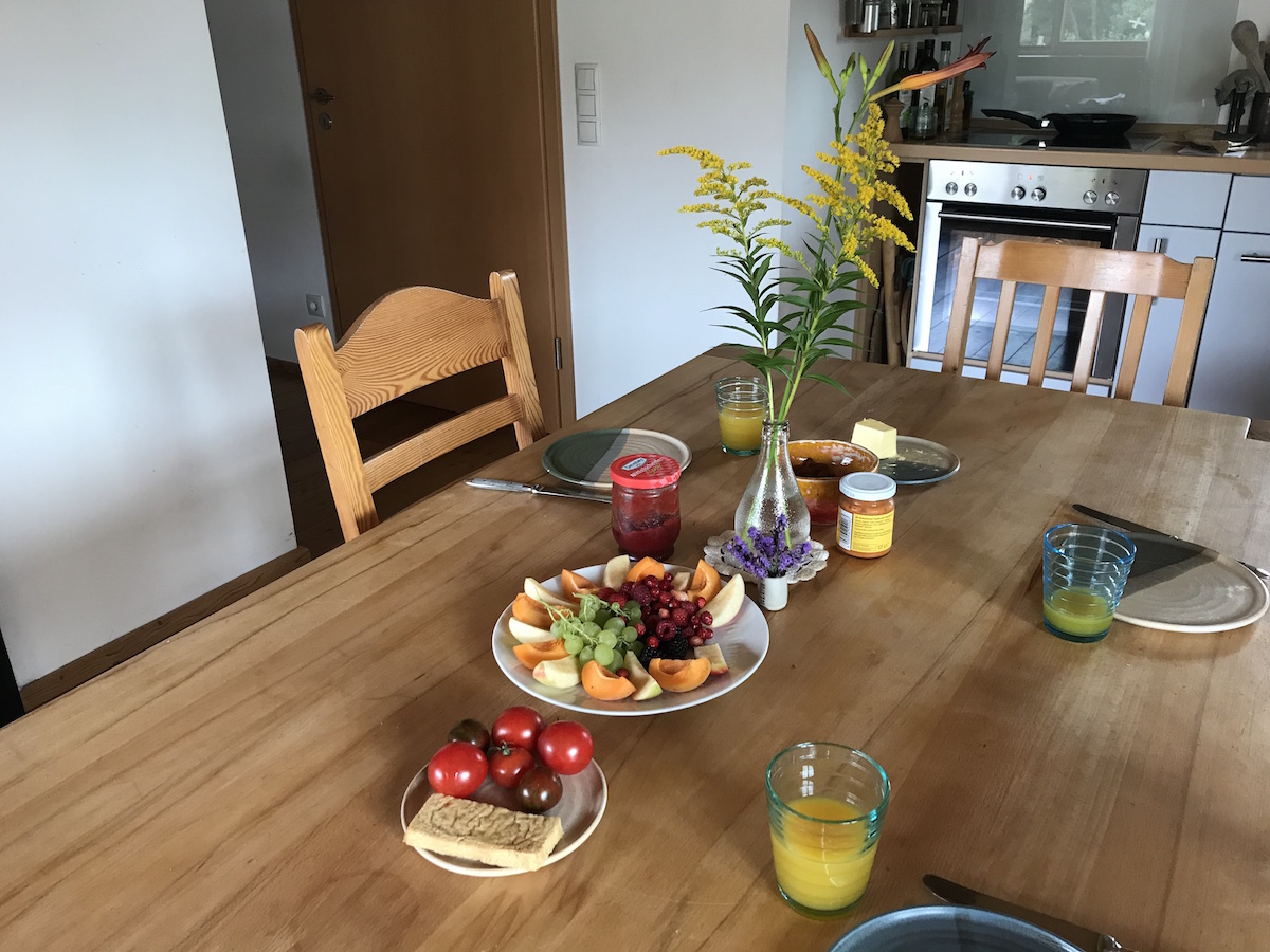 Es gab mal wieder einen schön gedeckten Frühstückstisch. Zur Samstagmorgenstimmung stell dir noch “Ode an die Freude” auf der Blockflöte gespielt vor. Das hatte der Wolf nämlich als Ohrwurm (vom Trompetenunterricht) und sich am Freitag abend selbst auf der Flöte beigebracht. Entsprechend ambitioniert war er, das Lied zu üben.