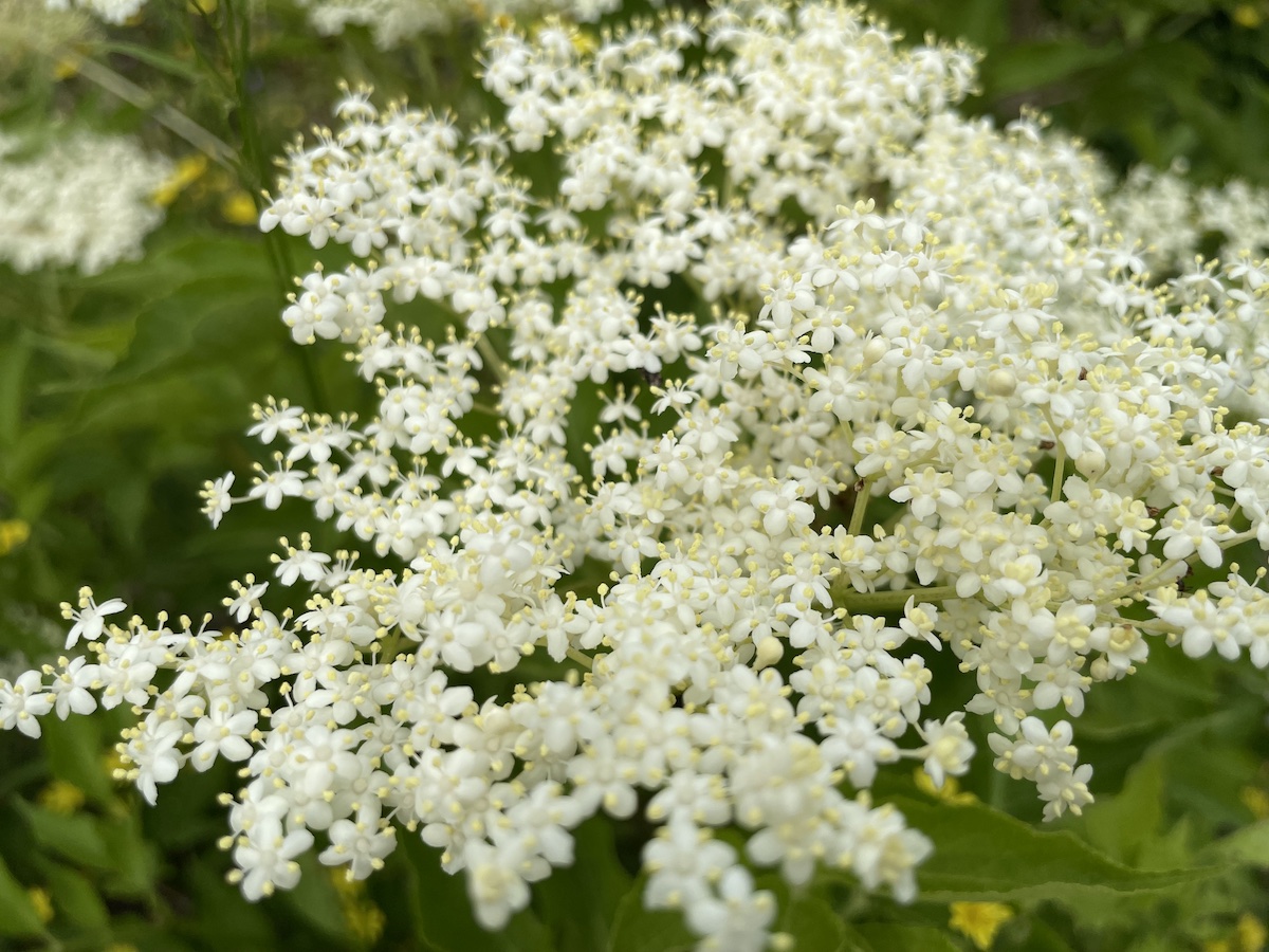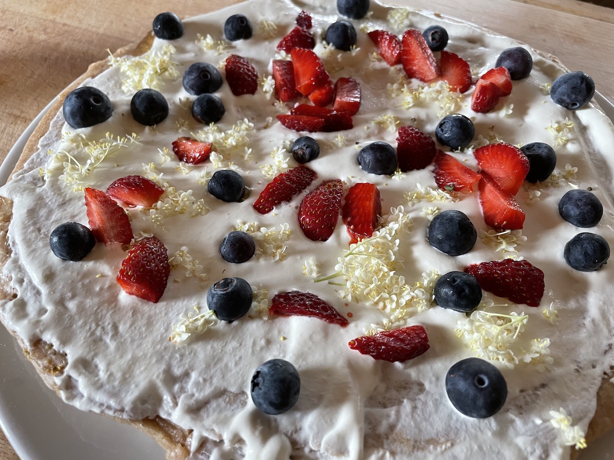 Am Nachmittag experimentiere ich ein wenig in der Küche. Ich habe von einer Holundertorte gelesen, aber keine Zutaten dafür im Haus. Allerdings steht von gestern noch ein Becher geschlagene vegane Sahne im Kühlschrank (die Tochter und ich hatten einen kleinen Eiskaffee) und Holundergelee vom letzten Jahr von der Tochter. Also habe ich einen dicken Riesenpfannkuchen gebacken und den mit Holundergelee, Sahne, Beeren und Holunderblüten belegt. Um dem Experiment noch eins oben draufzusetzen: wir hatten keine Hafermilch mehr, also hab ich aus Mandelmus und Wasser eine Mandelmilch für den Pfannkuchen gemixt. Use what you have – kann ich. War doch ganz lecker insgesamt. Lecker sind auch die Aprikosen aus der Abokiste, die gestern geliefert wurde. Hm. Ich will die gar nicht teilen.