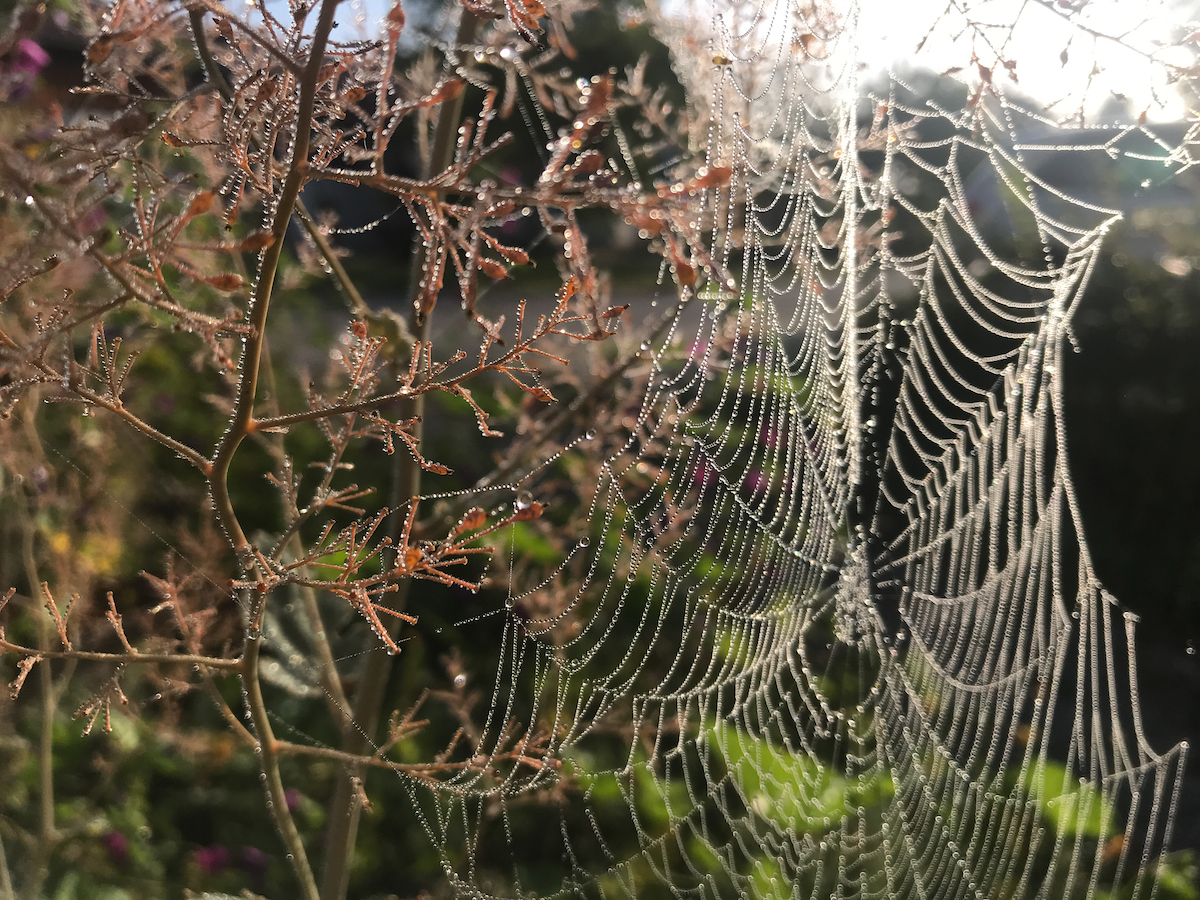 Wir schlafen richtig lange aus. Draussen scheint schon die Sonne und der Morgennebel hat sich fast verzogen. Einsam steht das Zelt im Garten. Ich sehe es vom Schlafzimmerfenster aus und finde doch ein bisschen schade, dass wir nicht draussen geschlafen haben. Ich mache mir ein gutes Frühstück. Ich habe in letzter Zeit etwas abgenommen und achte nun darauf, mich gut zu nähren. Draussen hängen Tautropfen in den Spinnennetzen und glitzern vor sich hin. Altweibersommer. Ich mag das so sehr!