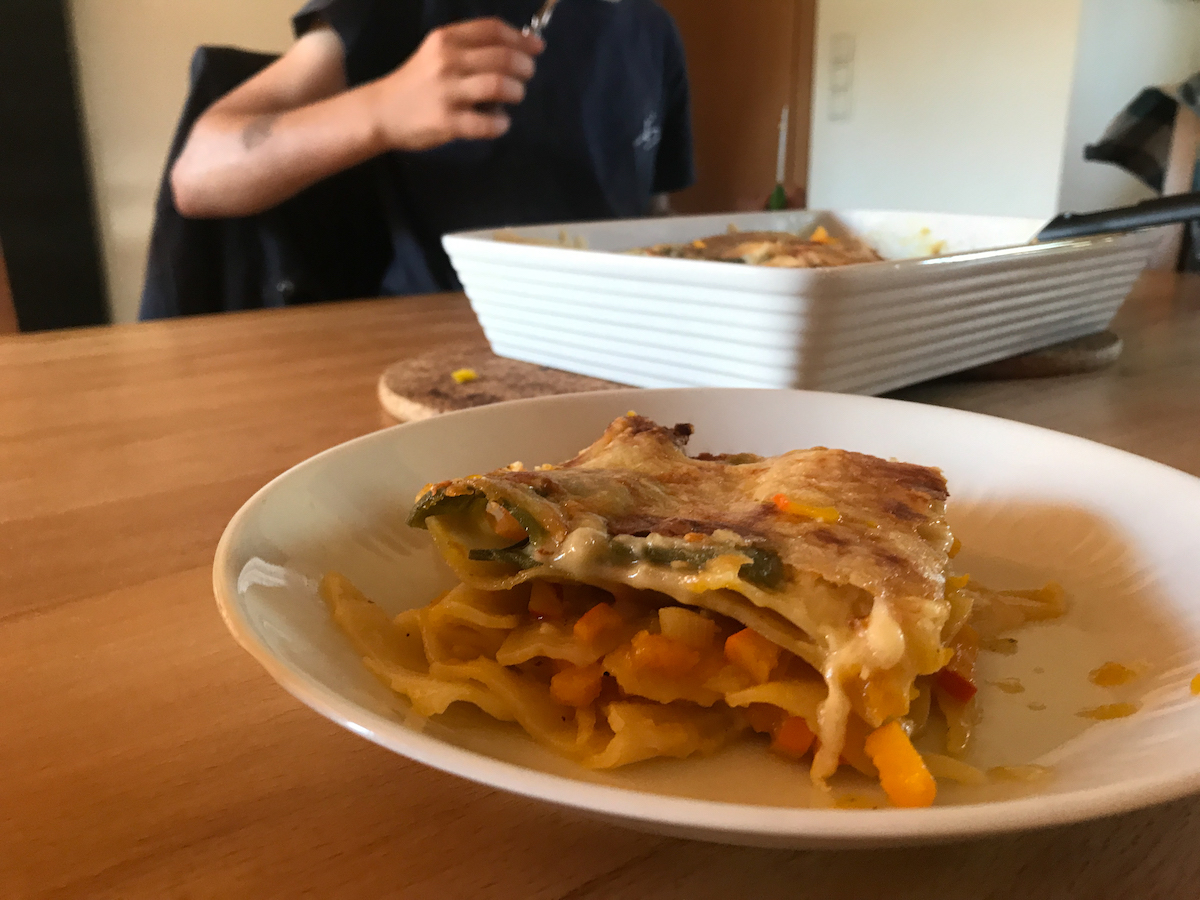 Zum Mittag gibt es die erste Kürbislasagne des Herbstes. Danach verbringen die Kinder den Tag draussen. Sie bauen ein Baumhaus in der Weide und fahren mit den Fahrrädern durch die Siedlung. Ich lese, schaue meine Kursvideos und übe Schrift. Ich streife ein bisschen durch den Garten und mache meinen täglichen Spaziergang.