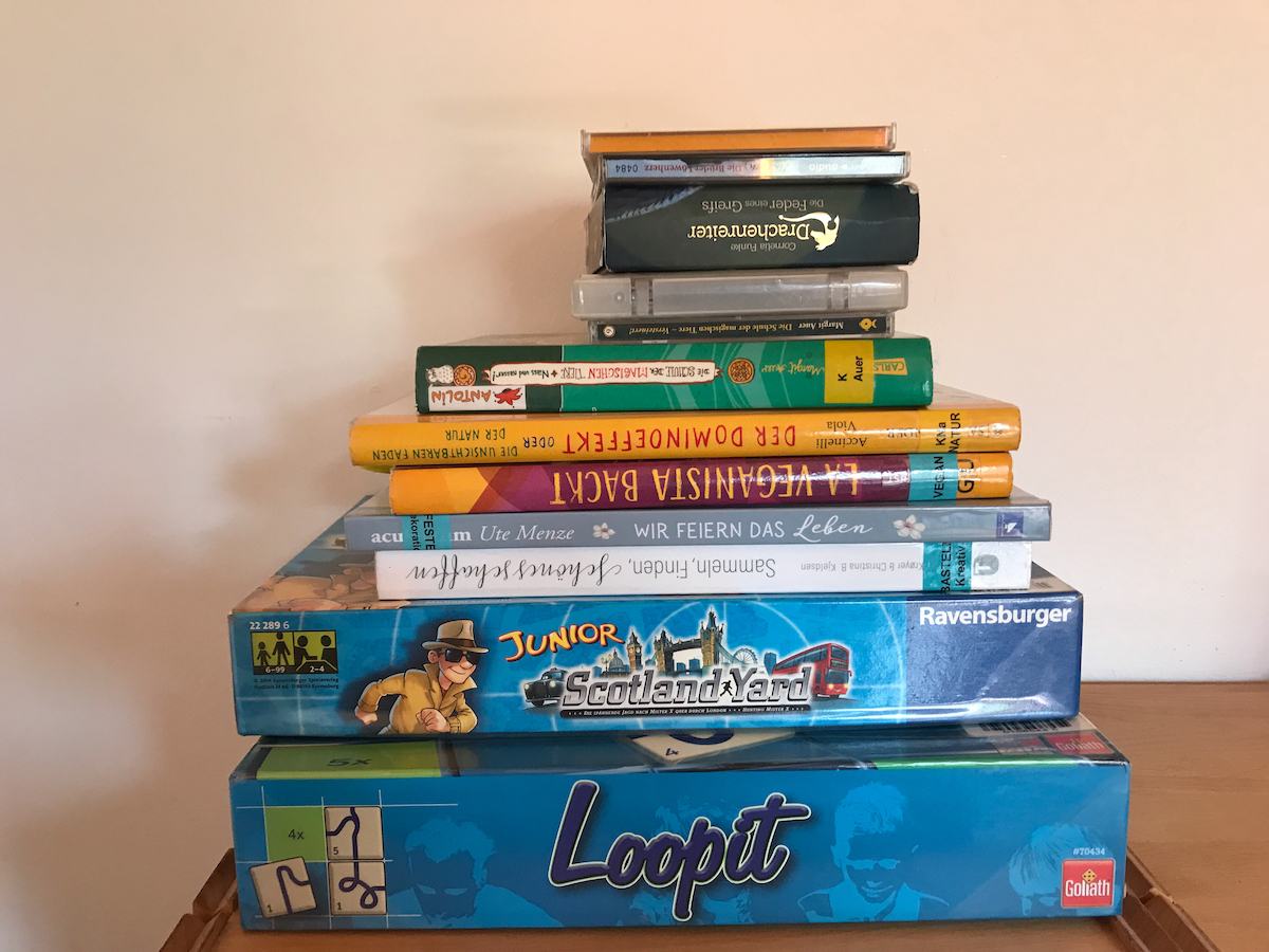 Nach dem Frühstück fahre ich mit dem Sterngucker zur Bibliothek. Das hatte ich ihm versporchen. Wir wollen nach neuen Spielen, Vorlesebüchern und Hörspielen schauen. ich hoffe auf ein inspirierendes Kochbuch, um den Speiseplan zu bestücken. Dafür hatte ich begonnen, eine lange Liste mit Ideen zu schreiben, denn gefühlt essen wir in letzter Zeit immer das gleiche. Leider werde ich nicht fündig, dafür wandern ein paar andere inspirierende Bücher auf unseren Ausleihstapel.