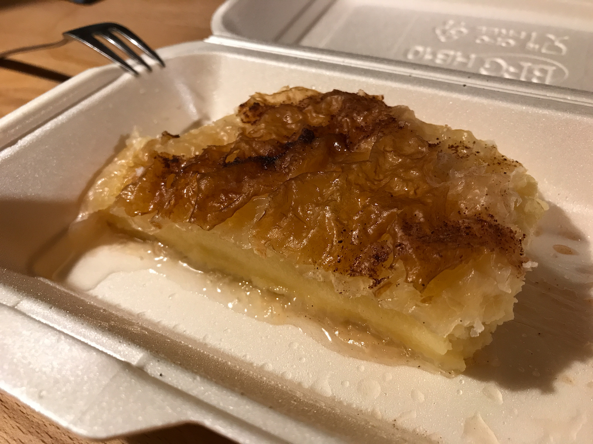 - Seezunge mit Tagesgemüse (grüne Bohnen) und Salat vom Griechen, Galaktobureko (in Sirup getränkter Filouteig mit Griess dazwischen – unerwartet lecker)