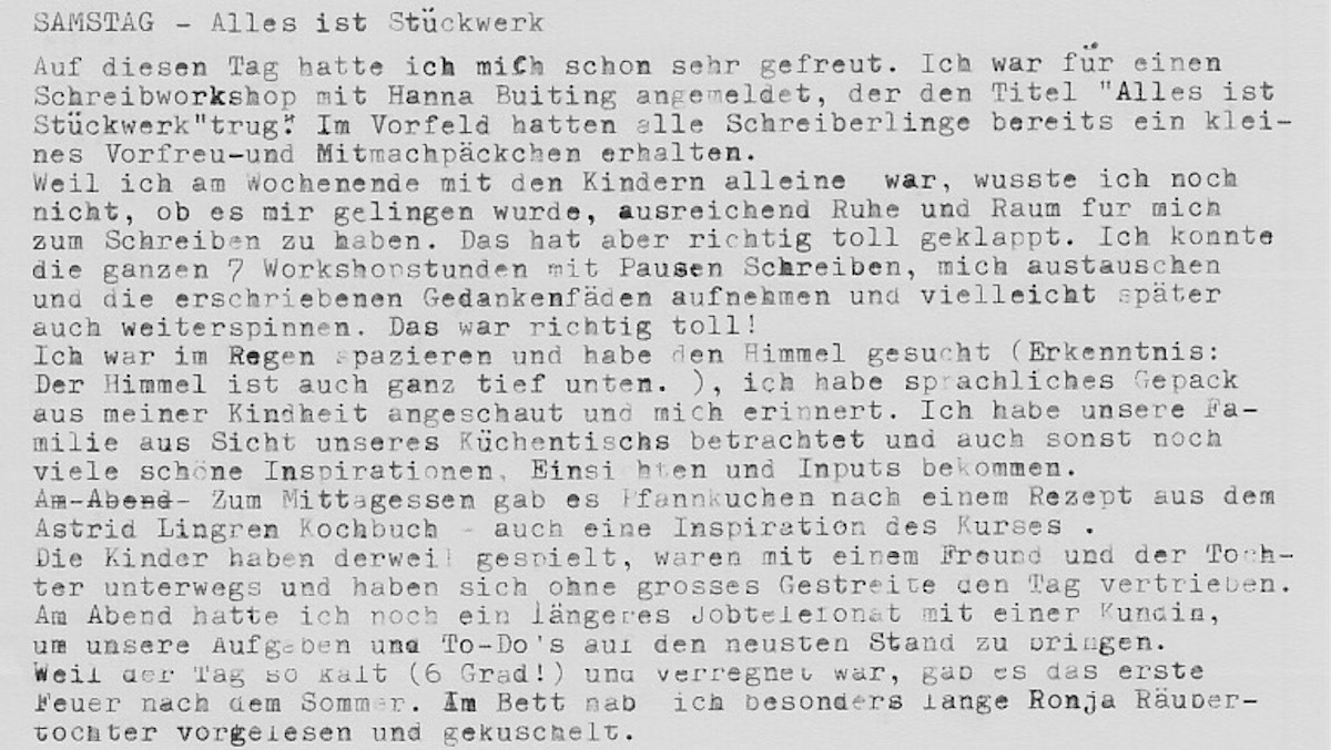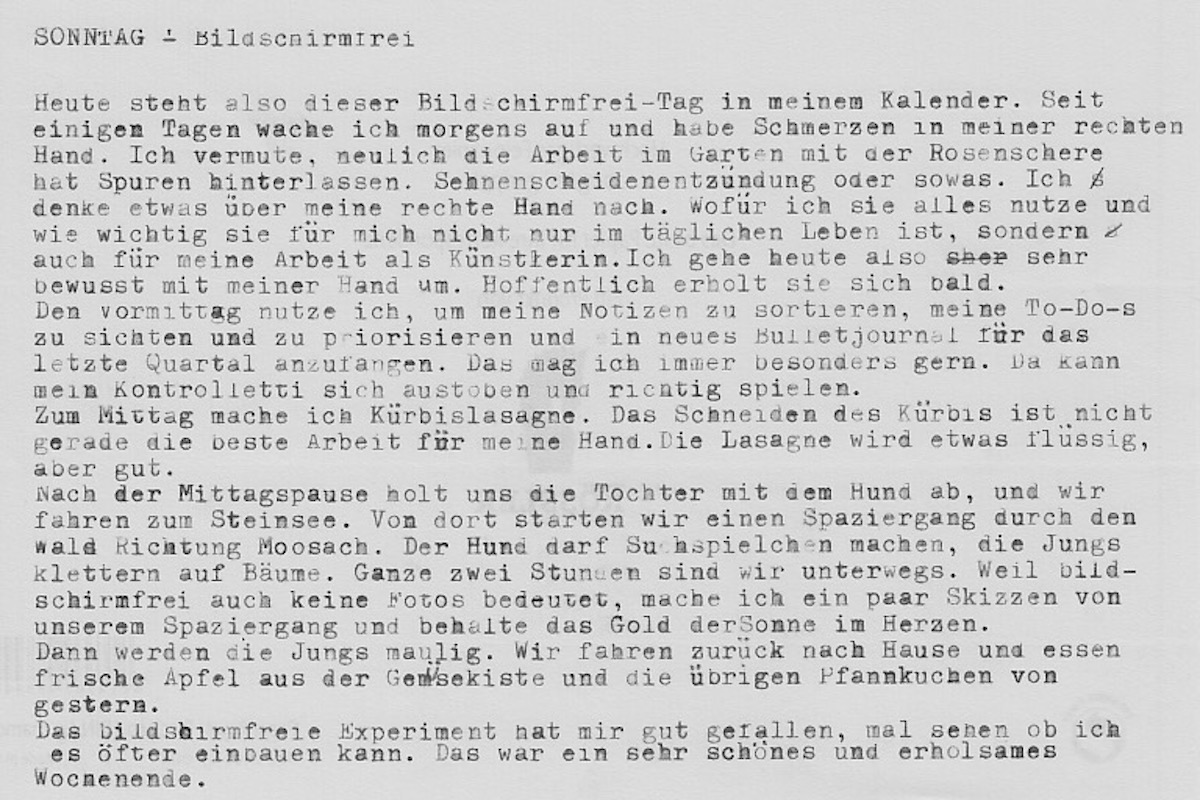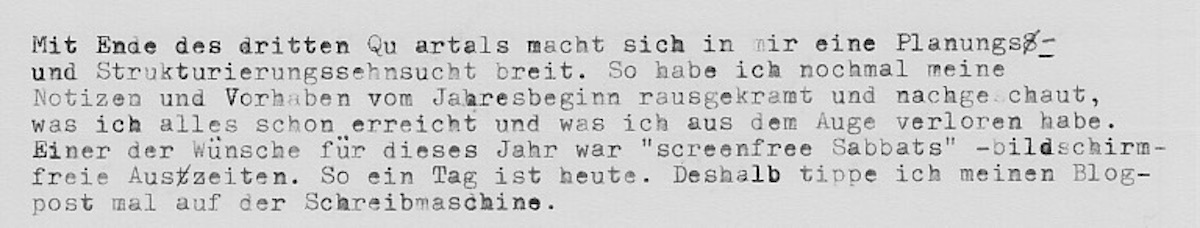 Am Wochenende hatte ich mir bildschirmfrei verordet. Deshalb gibt es heute einen halb analogen Blogpost, geschrieben auf der Schreibmaschine vom Flohmarkt. Auf dieser Schreibmaschine klemmt das kleine ü, da muss ich ein u tippen und die Punkte hinterher dranmalen.