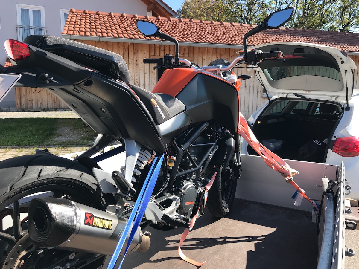 Ein großer Tag für die Tochter. Der Mann fuhr mit ihr und dem geliehenen Auto zuerst einen Anhänger, dann damit ein Motorrad abholen, was sie sich am Wochenende zuvor angeschaut hatten. Jetzt ist eine sehr glückliche Tochter ziemlich cool unterwegs. Man beachte die Agrapovitsch Powerparts und den Carbon Auspuff – beim Gegenlesen wurde ich gerade belehrt, dass der Auspuff von Agrapovic ist. Keine Ahnung habe ich!