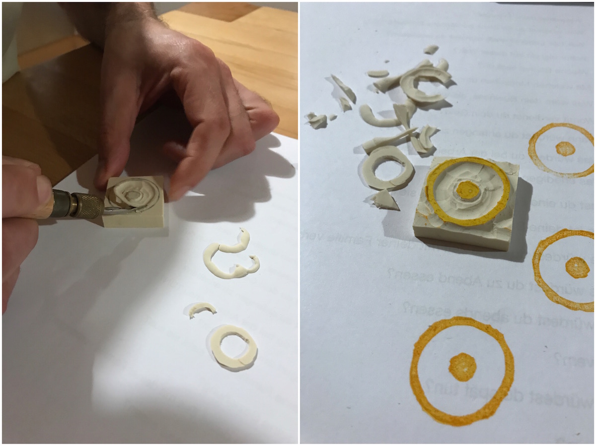 Weil ich neulich den Trompeten-Stempel geschnitzt habe, hatten die Söhne und der Mann auch Stempelschnitzlust angemeldet. Also begleitete ich den Wolf und den Mann bei der Stempelherstellung. Der Wolf hat sich einen Wolfskopf geschnitzt, der Mann einen Gong.