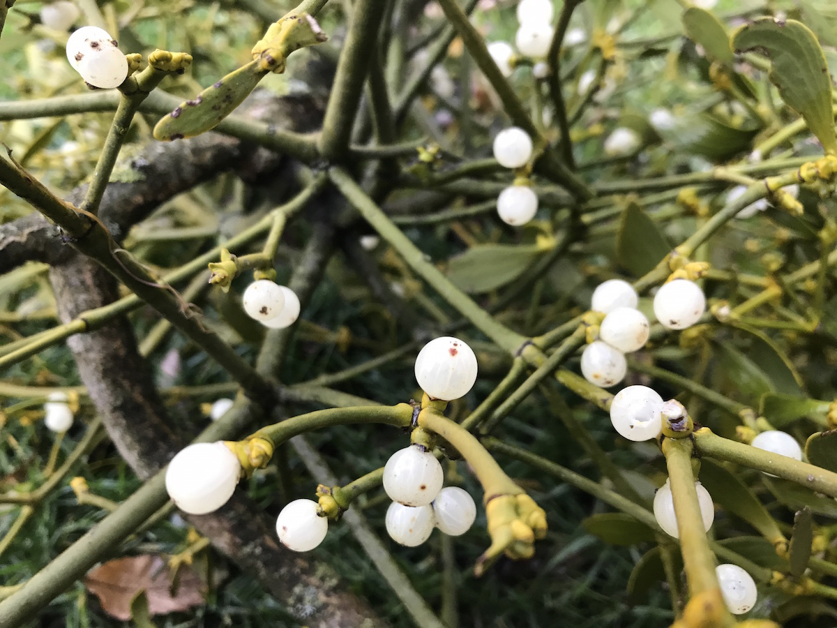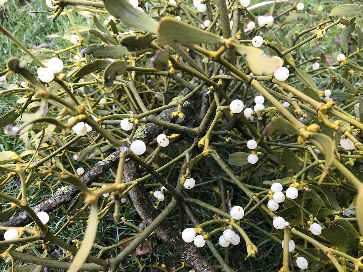Wir hatten Glück! Der Mann entdeckte vom Auto aus einen großen abgebrochenen Ast mit zwei großen Mistelbüscheln. Mich kann man mit so einfachen Dingen glücklich machen. Freudestrahlend packte ich das Ding ins Auto und schmückte daheim das Haus.