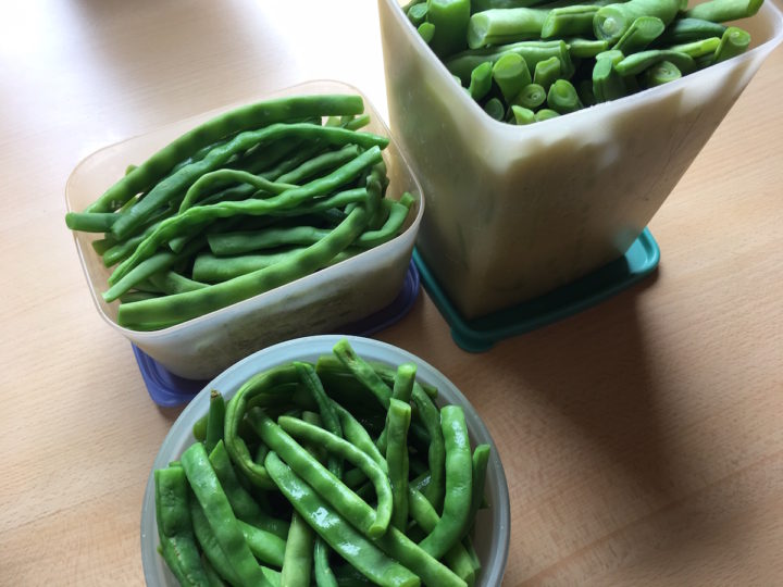 Nach meinem Einkauf haben wir endlich wieder Obst im Haus. Nach dem Frühstück kümmere ich mich um die Wäsche und die vielen Bohnen aus dem Garten. Letztere blanchiere ich und friere sie ein für ein andermal, wenn wir nicht täglich Bohnen essen.