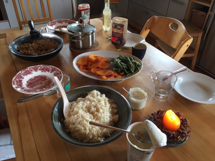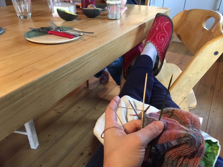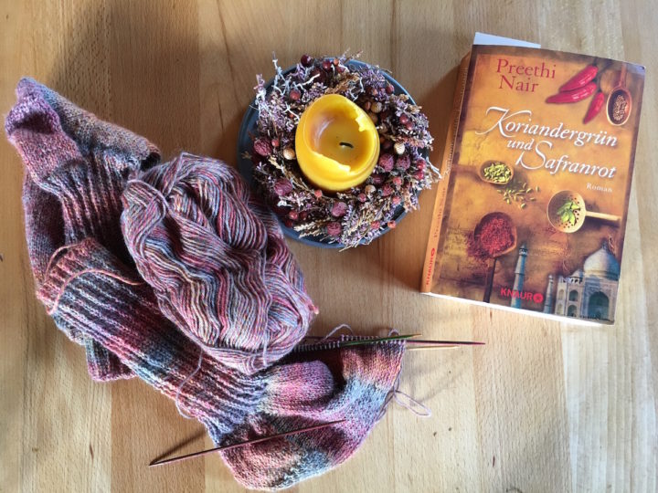 Zum Mittag gibt es Reis, Dhal, Kichererbsen, Kürbis und Bohnen. Indisch angehauchtes Essen wird von allen hier sehr geliebt. Dazu passt das Buch*, was ich gerade lese. Ich bin in der Mitte des Buches und jetzt auch richtig in der Geschichte angekommen. Deshalb lese ich am Nachmittag noch bisschen und stricke weiter an meiner Socke.