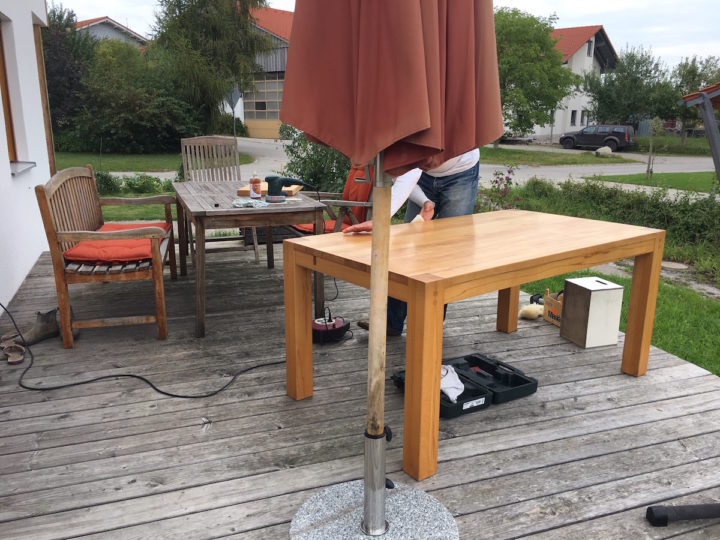 Der Mann hat derweil einen Friseurtermin. Danach schleift er unseren Tisch ab. Der Wolf mäht derweil den Rasen. So entsteht ein geschäftiges Treiben draussen. Ich schneide Pflanzen zurück, steche Unkraut aus und ernte Tomaten, Zierkürbise und Bohnen. So werkeln wir uns durch den Nachmittag. Die Kinder spielen am Spielplatz.