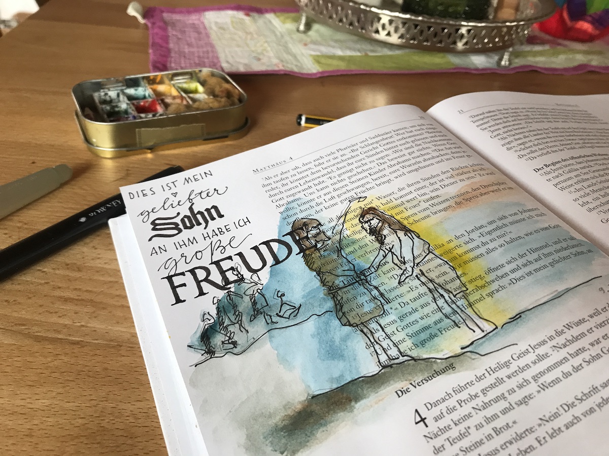 Ich habe die Bastelkiste ausgemistet und neu einsortiert. Wir sammeln leere Klopapierrollen und kleine Schachteln, Korken, Perlen und Stäbchen zum Basteln mit der Heissklebepistole. Im Laufe des Tages hatte ich auch Zeit zum Stricken und Lesen, zum Schreiben und zum Zeichnen. Ich habe immer noch große Freude an meinem Fastenzeitbuch. Der Impuls vom Freitag inspirierte mich zu ein bisschen Bible Art Journaling.
