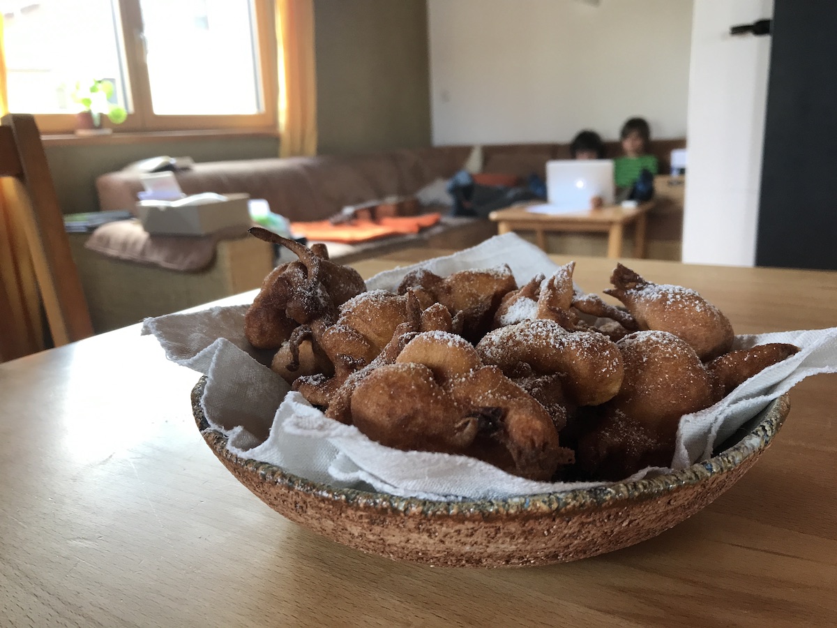 Die Runde war kurz. Als ich nach Hause kam, überkam mich eine Kindheitserinnerung. Kräppelchen. Jenes Gebäck, was ich als Kind sehr liebte und mir als Mitbringgebäck im Kindergarten oder zu Festen wünschte. Ich versuchte mich an der Originalversion mit Ei und einem veganen Experiment. Beide sind gut geworden. Die Kinder fanden das sehr lecker und waren begeistert.