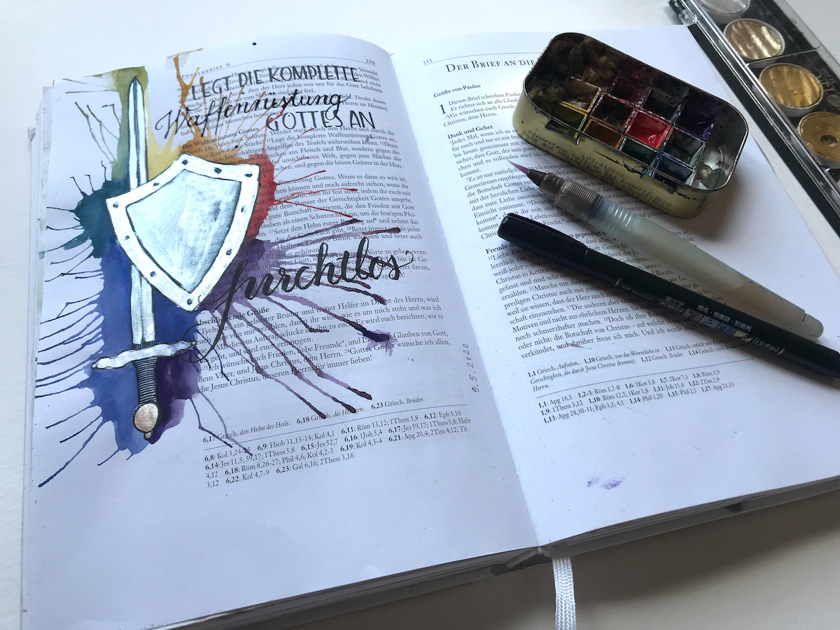 Am Morgen habe ich noch beim Bibelartjournaling via Zoom mitgemacht. Ich habe eine Stelle aus dem Epheserbrief (die Waffenrüstung Gottes) gestaltet. Das Bild hatte ich in der Vergangenheit schon begonnen und jetzt einfach fertig gemacht.